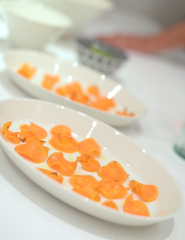Tee näin: Kuori ja viipaloi porkkanat ohuiksi siivuiksi. Mitä ohuempia siivuja, sen parempi. (Itse käytin hieman tylsää juustohöylää). Liota viipaleet n. 1 tunnin verran vedessä jossa on teelusikalleinen Maizenaa. Esilämmitä uuni 225 asteeseen. Kuivaa porkkanasiivut paperilla tai pyyhkeellä kuivaksi. Pyöräytä porkkanasiivut oliiviöljyssä ja levitä uuniritilälle. Paista porkkanasiivut 13-14 minuuttia uunissa keksitasolla. Vinkki: laita uunipelti ritilän alle keräämään porkkanoista tippuvan nesteen. Ole tarkkana kellonajan kanssa. Porkkanat palaa helposti, mutta liian lyhyeksi jäänyt paistoaika jättää lastut pehmeiksi. Meidän paksuimmat viipaleet jäivät hieman pehmeiksi 13 minuutin paistoajan jälkeen, mutta ohuet oli jo rapsakat. Ripottele lopuksi suolaa lastujen päälle.. Nam.